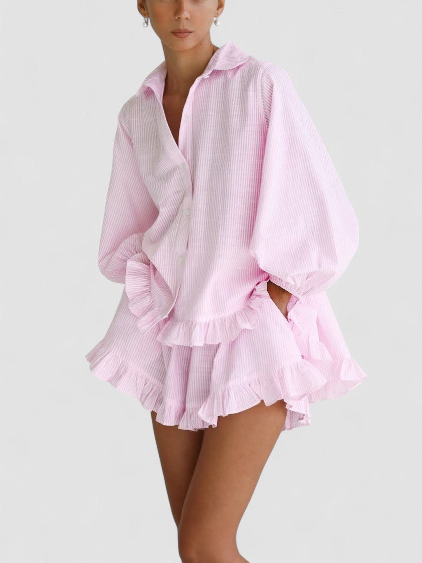 Setul Ava de Eleganță Jucăușă cu Volane este combinația perfectă între farmec și stil fără efort. Cu mânecile sale voluminoase și accentele jucăușe de volane, acest duo de top și pantaloni scurți aduce o vibrație lipsită de griji zilei tale. Fie că te relaxezi, iei Maroch sau ieși la o plimbare în vreme caldă, acest set oferă confort cu o notă de declarație.