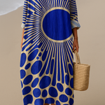 L'abito Zoe Horizon è un pezzo accattivante che combina linee audaci e Culoarei vivaci per un effetto straordinario. Il grande design circolare al centro attira l'attenzione, mentre il motivo geometrico a raggi di sole aggiunge un tocco artistico e contemporaneo. La vestibilità rilassata e il tessuto fluido offrono comfort, rendendolo perfetto per uscite informali o giornate in spiaggia.