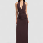 - Design: Rochie maxi ajustată cu decolteu halter adânc și talie plisată