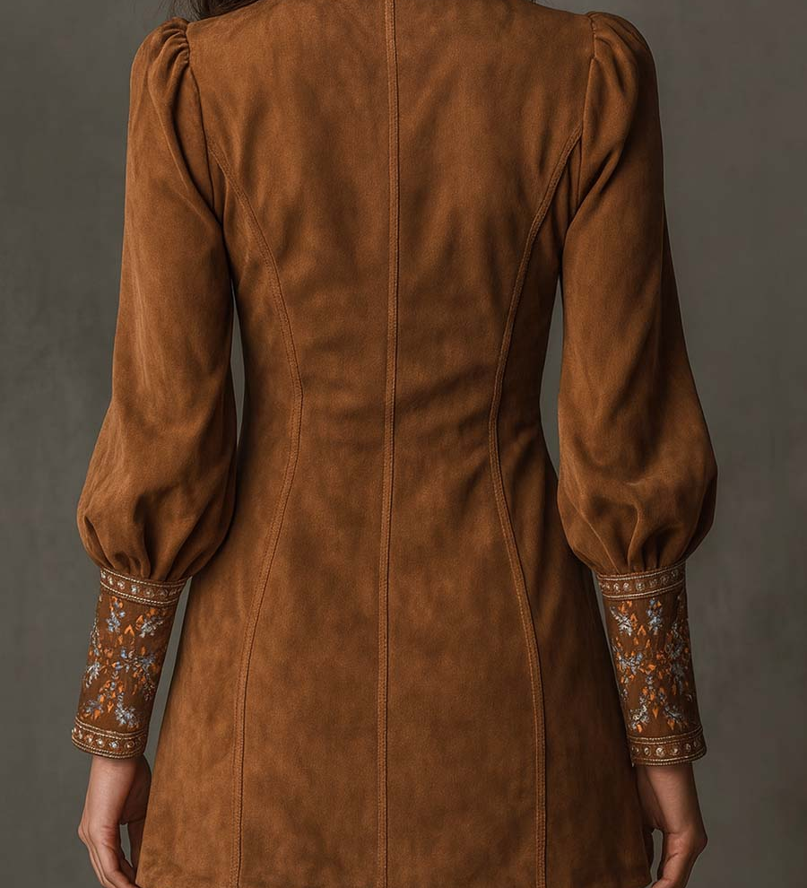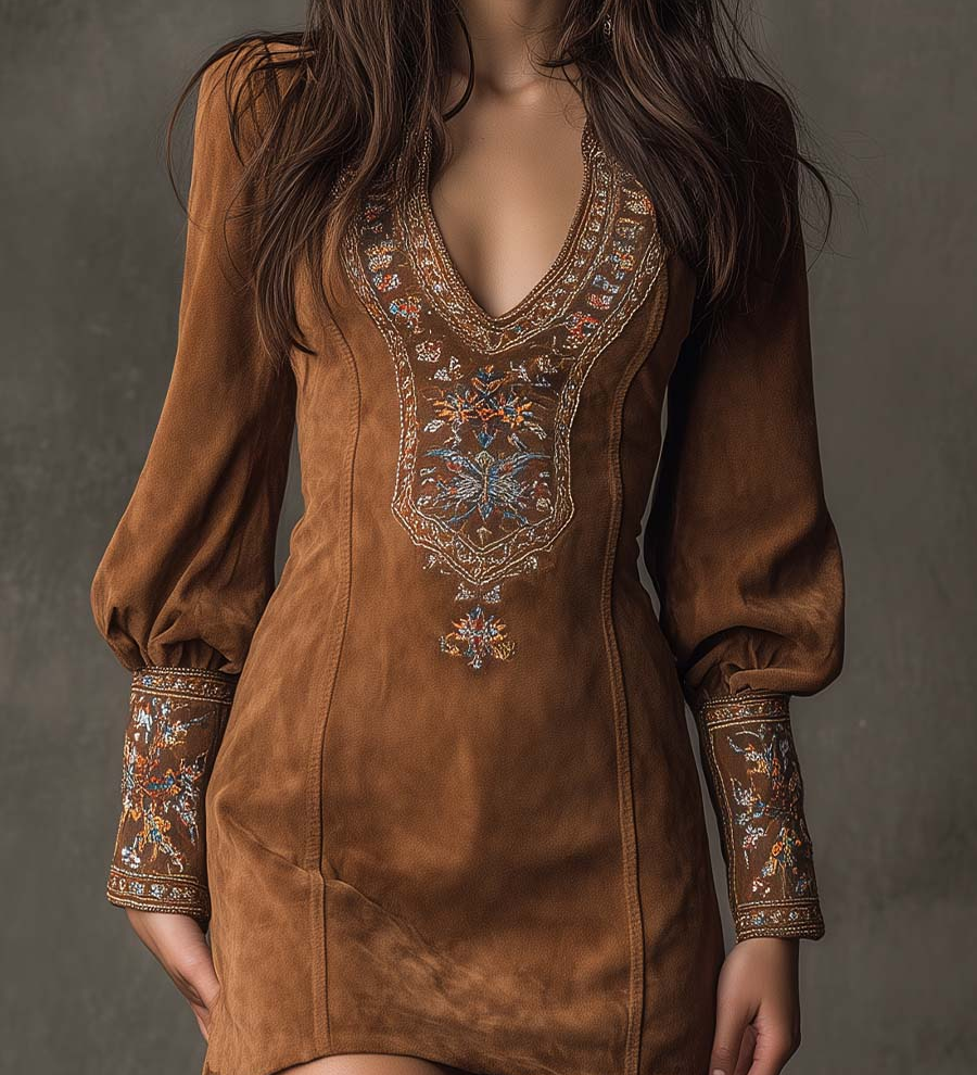 Amalia | Rochie mini vintage maro din suede cu decolteu în V și broderie