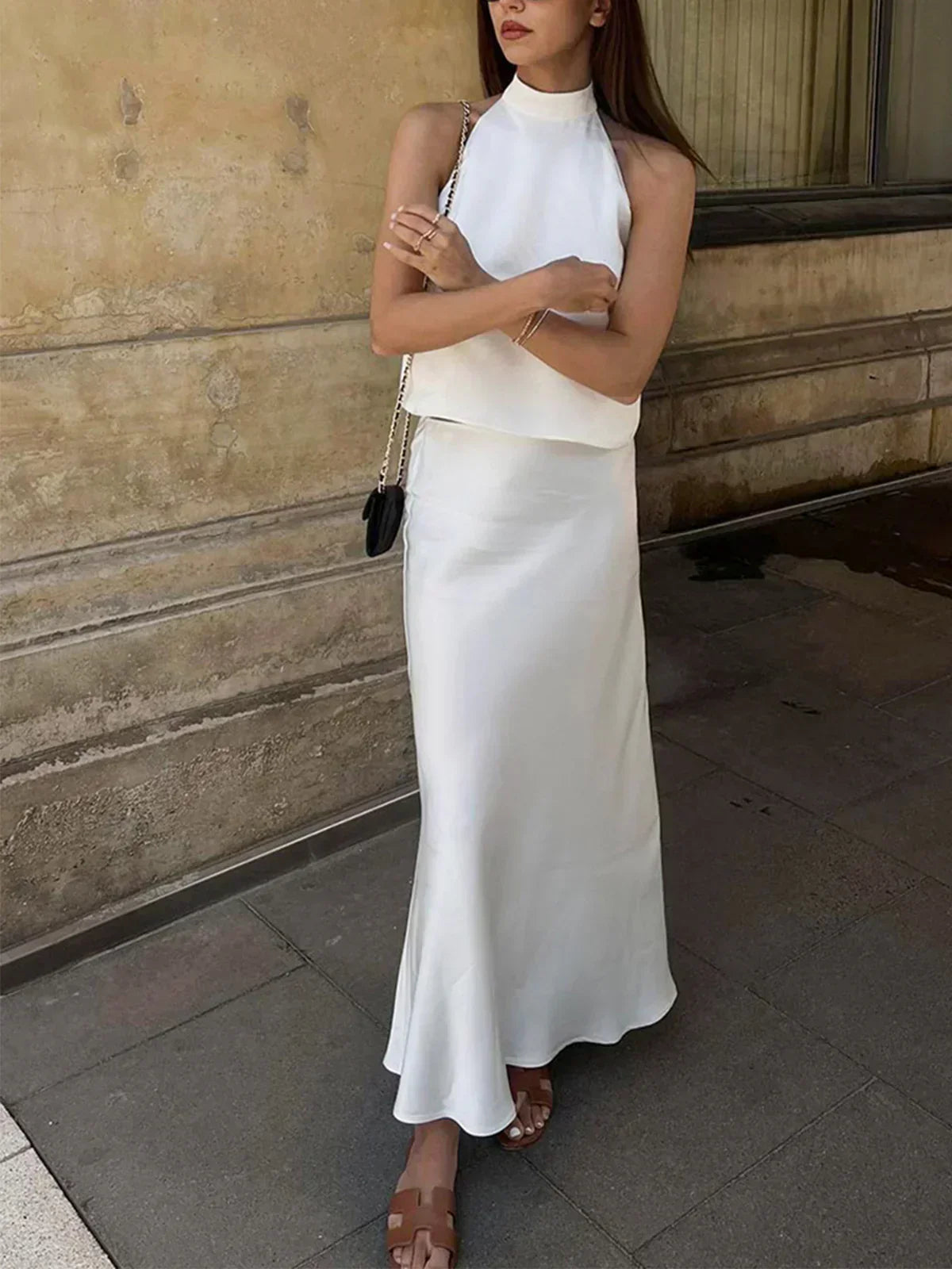 Design: Un set rafinat din două piese, cu un top scurt elegant din satin cu un design cu spate deschis, asociat cu o fustă maxi fluidă cu talie înaltă. Țesătura luxoasă și silueta minimalistă emană o sofisticare fără efort.